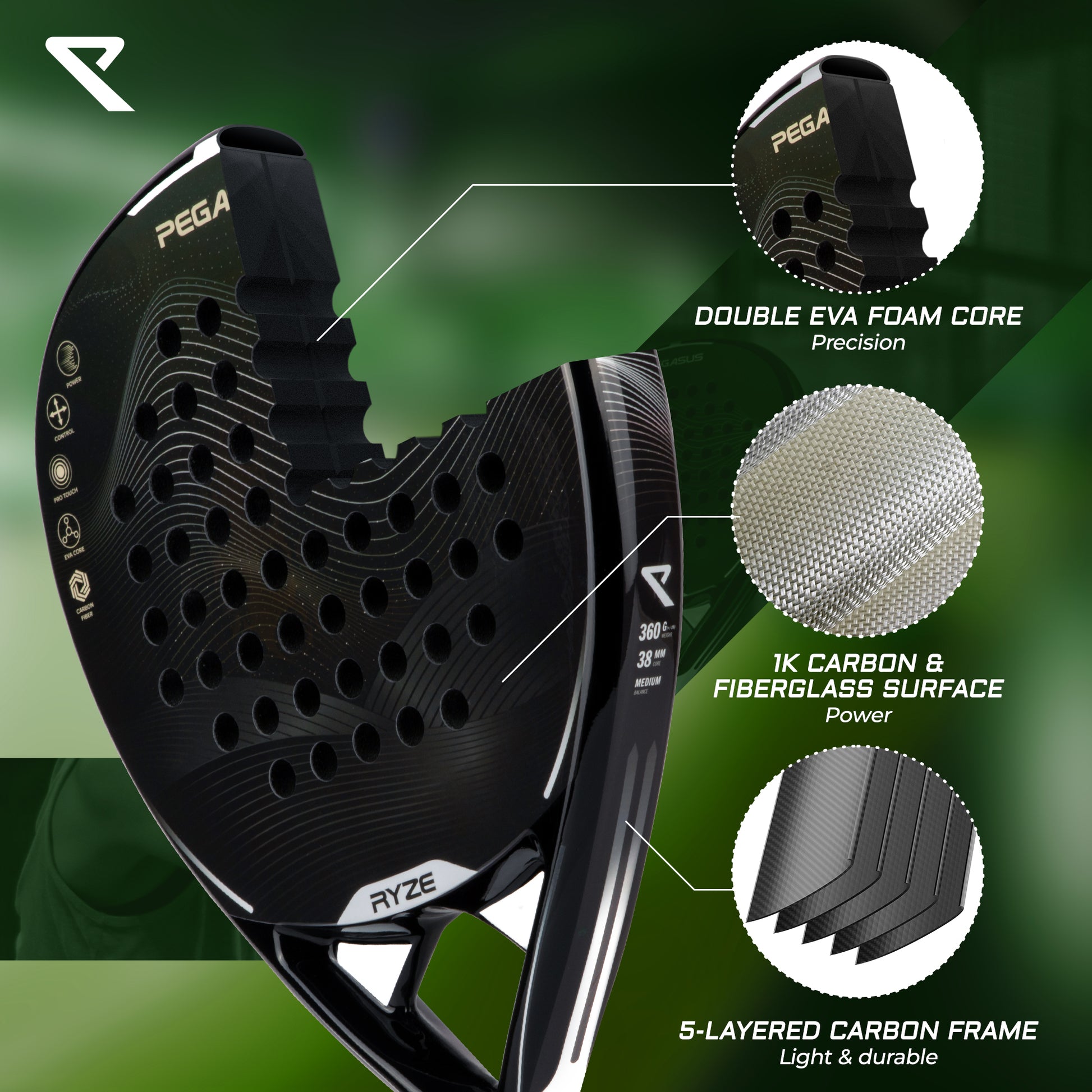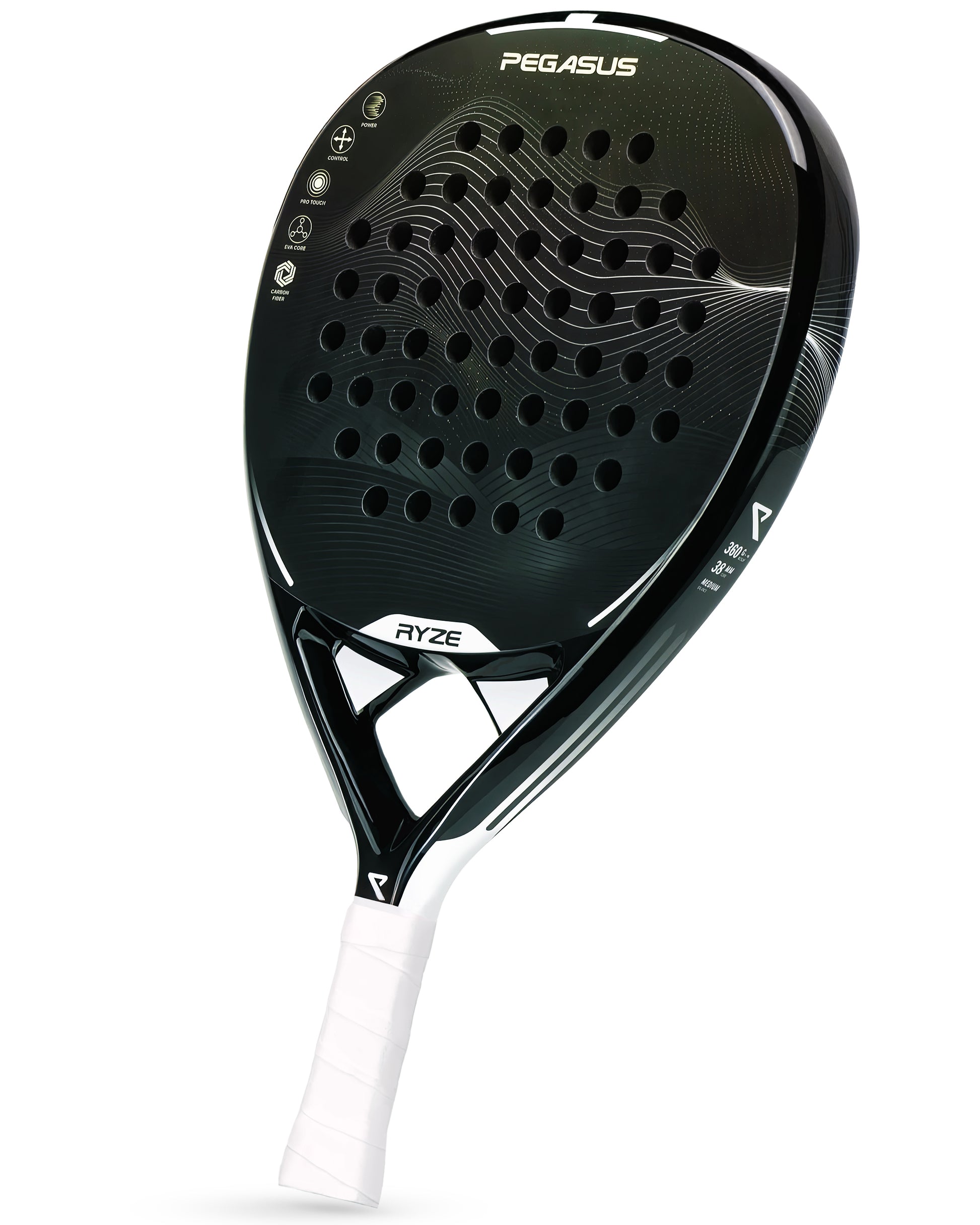 The RYZE PEGASUS offers the perfect blend of power and control, thanks to its EVA-17 foam core and 3D-patterned surface. Ideal for intermediate players. The 1K carbon fiber frame makes it lightweight yet durable.