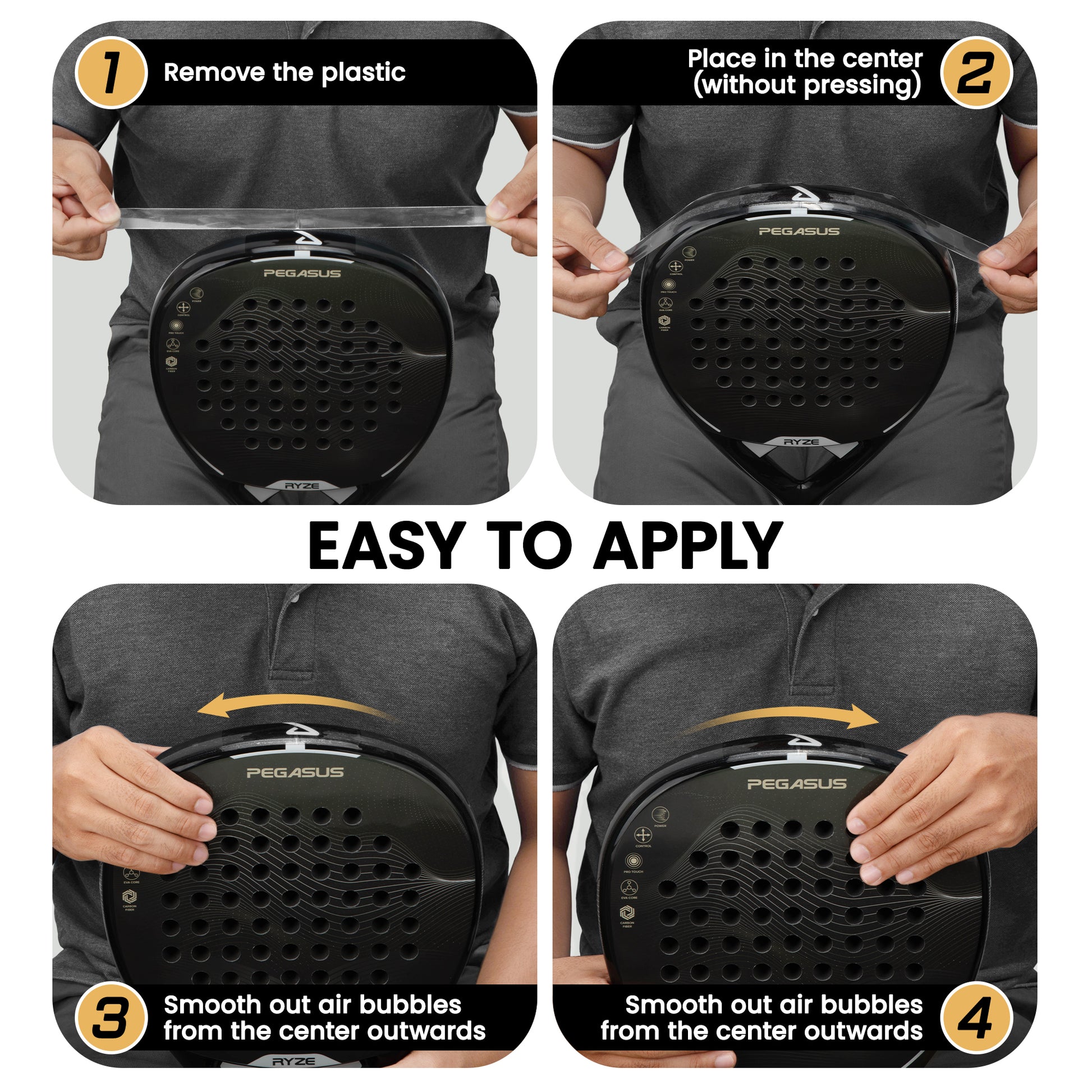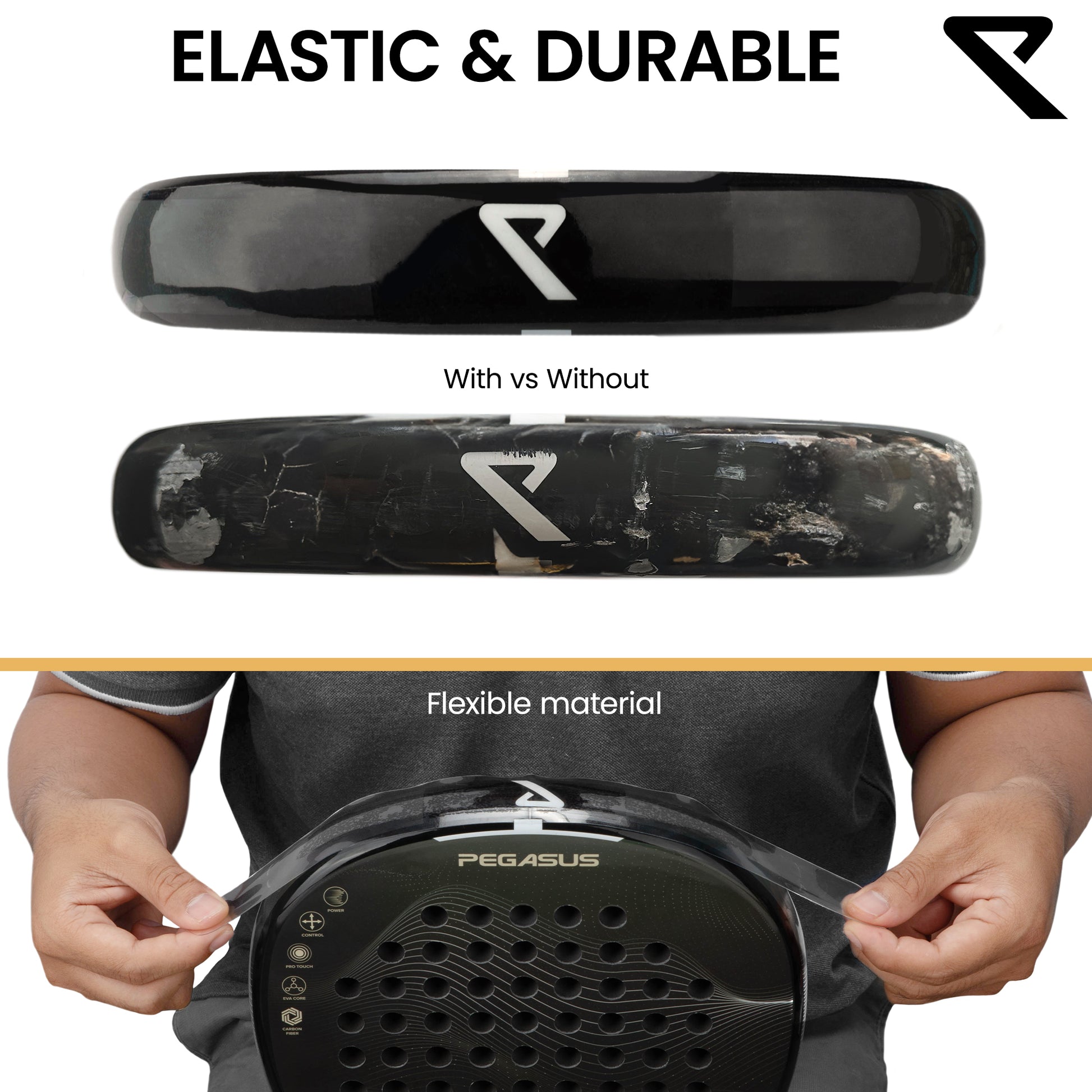 EASY APPLICATION – Flexible, adhesive design for effortless application, preserving the racket’s surface and paint.